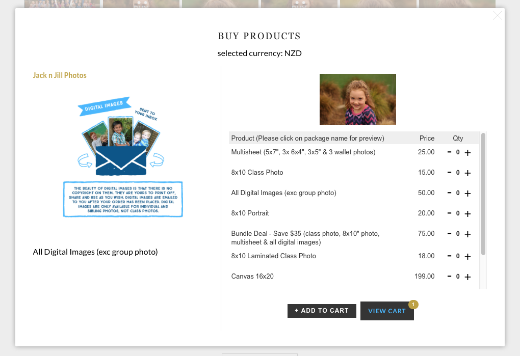 Click on the product name to see a preview of each item. Use the plus and minus buttons to increase/decrease the quantity of each item you want to buy. Once you are happy, press ‘add to cart’.
